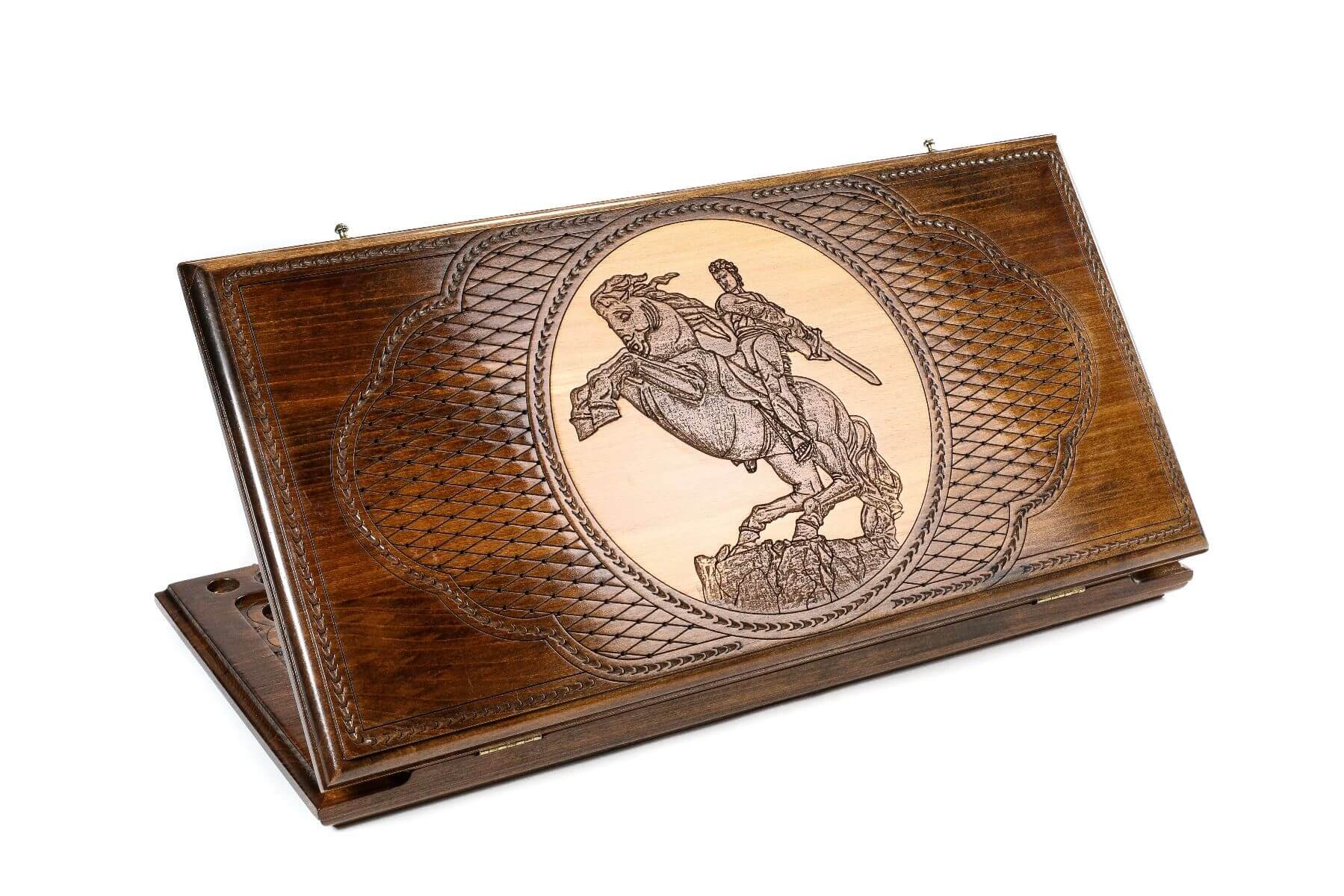 Nous vous proposons un nombre limité de ces plateaux de backgammon en bois à l'effigie de David de Sassoun. Nos créateurs ont déjà produit cinquante de ces pièces uniques en leur genre et ont accepté de produire un nombre supplémentaire de pièces en fonction de votre demande.