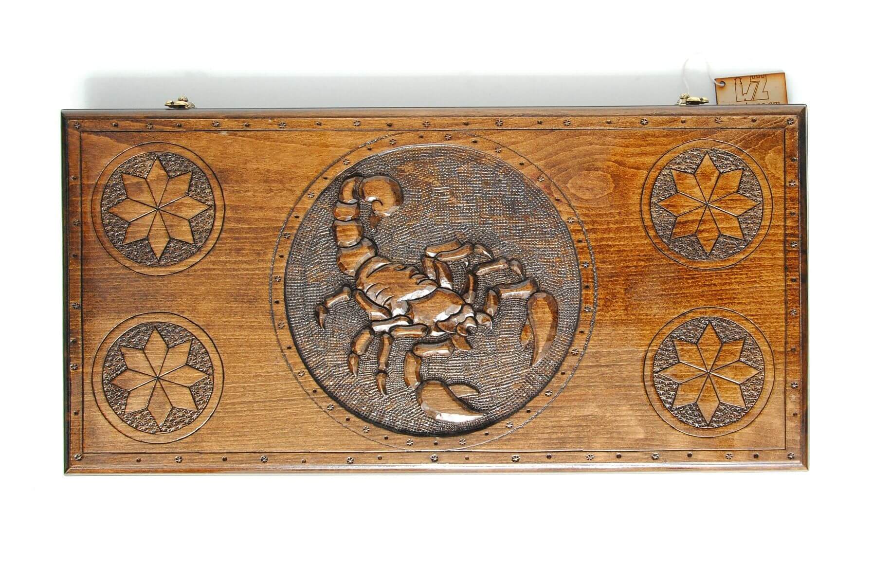 Nous vous proposons un nombre limité de ces plateaux de backgammon en bois à l'effigie d'un somptueux scorpion. Nos créateurs ont déjà produit cinquante de ces pièces uniques en leur genre et ont accepté de produire un nombre supplémentaire de pièces en fonction de votre demande.