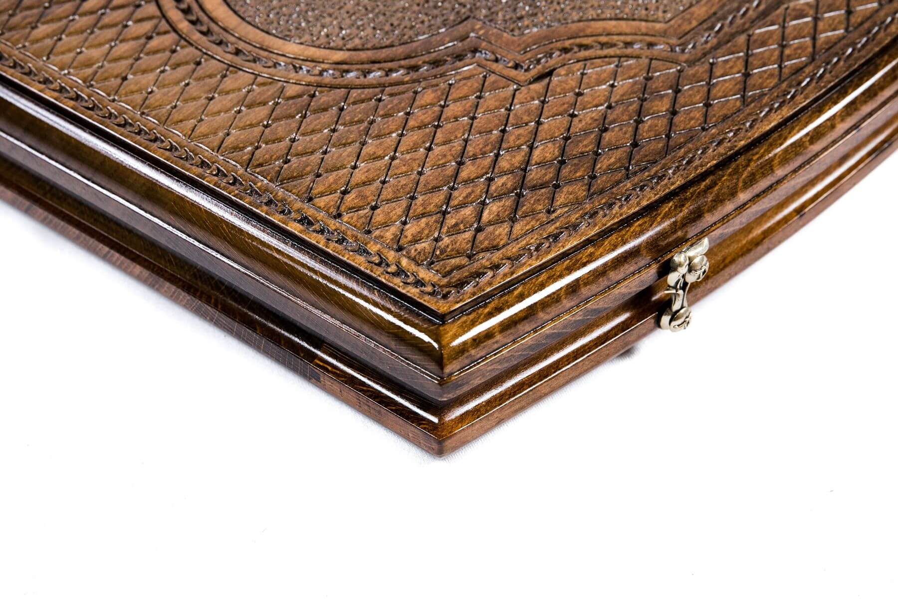 Nous vous proposons un nombre limité de ces plateaux de backgammon en bois à croix celte. Nos créateurs ont déjà produit cinquante de ces pièces uniques en leur genre et ont accepté de produire un nombre supplémentaire de pièces en fonction de votre demande.