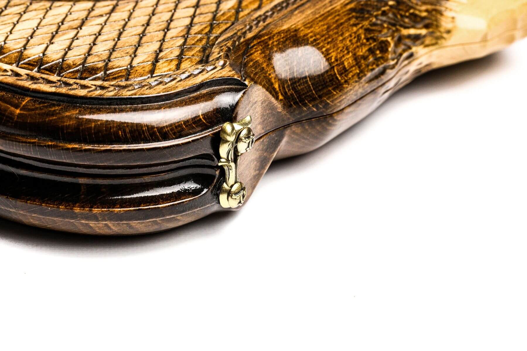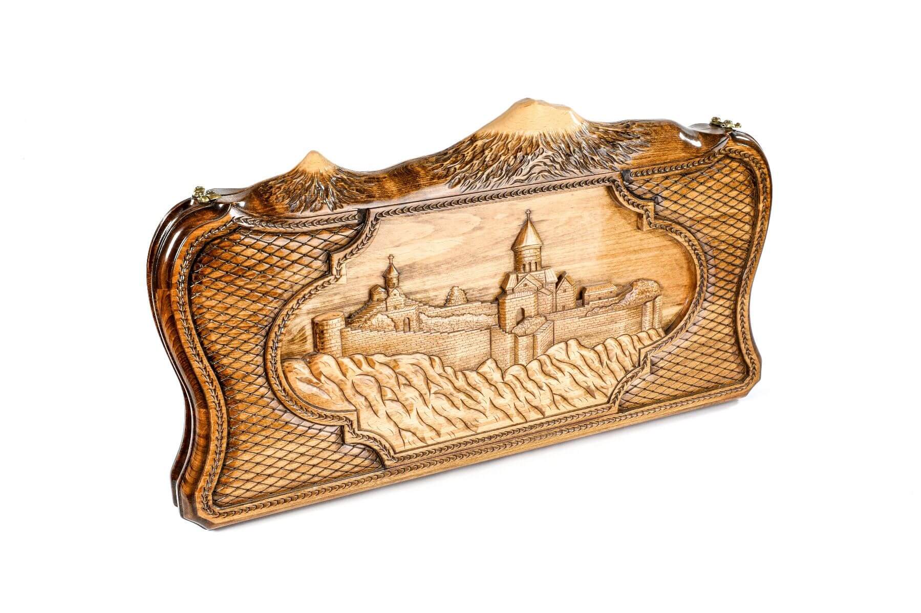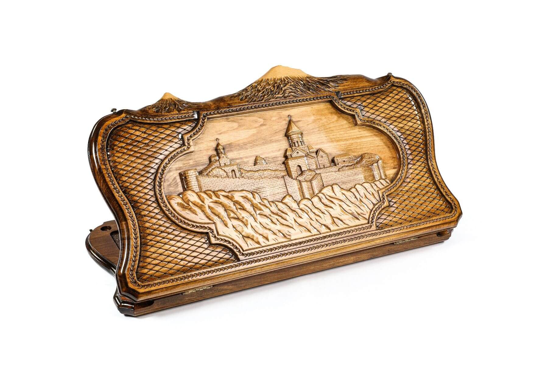 Nous vous proposons un nombre limité de ces plateaux de backgammon en bois à l'effigie du monastère Tatev. Nos créateurs ont déjà produit cinquante de ces pièces uniques en leur genre et ont accepté de produire un nombre supplémentaire de pièces en fonction de votre demande.